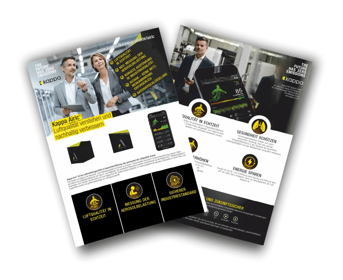 Hochsensible Sensoren in Industrieausführung messen dabei permanent die Qualitätsindikatoren der Raum- und Hallenluft. Die ermittelten Messwerte werden verschlüsselt an eine Softwareplattform – Kappa Scopic® – übertragen. Dort werden sie bewertet, verdichtet und zum Kappa AQI (Air Quality Index) verdichtet. Er veranschaulicht die aktuelle Luftqualität in einem Wert. Die Ergebnisse werden geräteunabhängig und in Echtzeit zur Verfügung gestellt. So können qualitative Aussagen über die Luftqualität getroffen und Handlungsfelder abgeleitet werden.